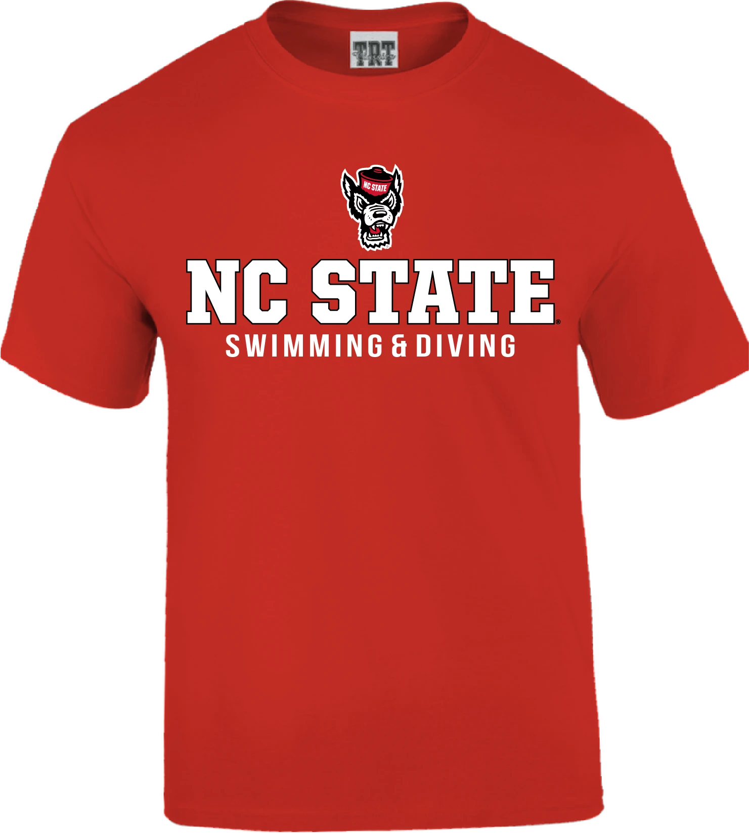 - Screen printed NC State Swimming & Diving wordmark and Wolfhead logo